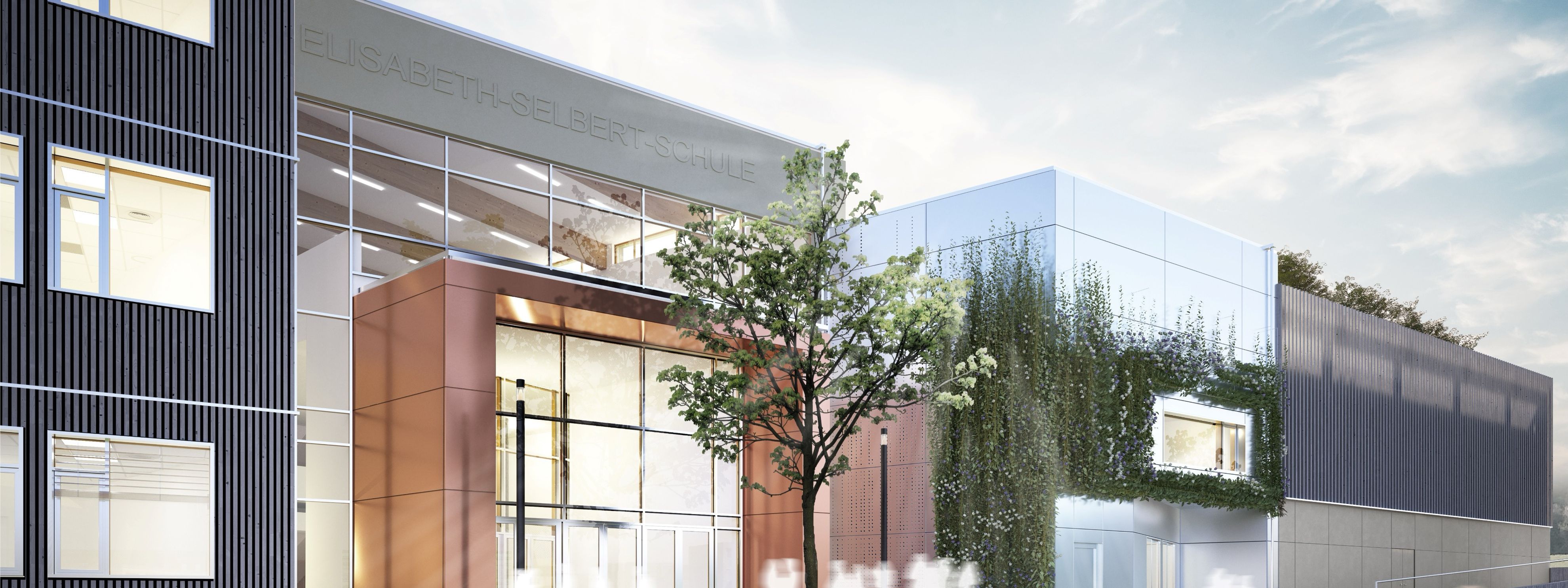 - vorgefertigtem Holztafelbau und Begrünung der Fassade